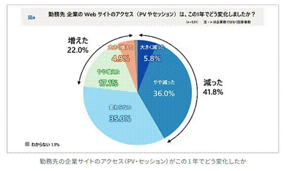 全国のB2Bビジネスに携わる会社員や経営者を対象とした調査では、531名が回答しました。勤務先の企業サイトのアクセス(PV・セッション)がこの1年でどう変化したかという問いに対し、「大きく減った・やや減った」の合計が41.8%にのぼり、「増えた」(22.0%)を大きく上回りました。このデータは、B2B業界全体として減少傾向にあることを示しています。