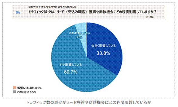 そして何よりも重要なのは、このトラフィック数の減少が、リード獲得や商談機会にどの程度影響しているかという問いに対し、「大きく影響している・やや影響している」と回答した企業が合計で94.5%にのぼった点です。