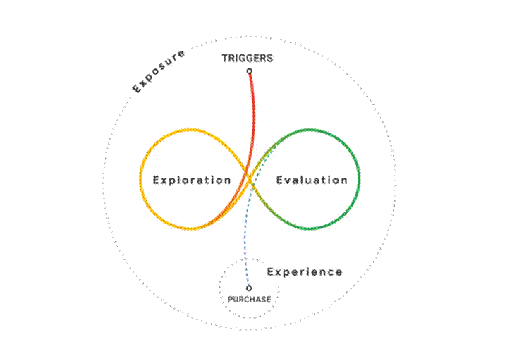 Googleが2020年に定義したMessy Middleという概念があります。これは従来型の直線的な購買ファネルとは異なり、人々は、「探索」と「評価」という2つのモードをループのように行きつ戻りつしながら、購入を決定するまでこのサイクルを必要な回数だけ繰り返すというものです。